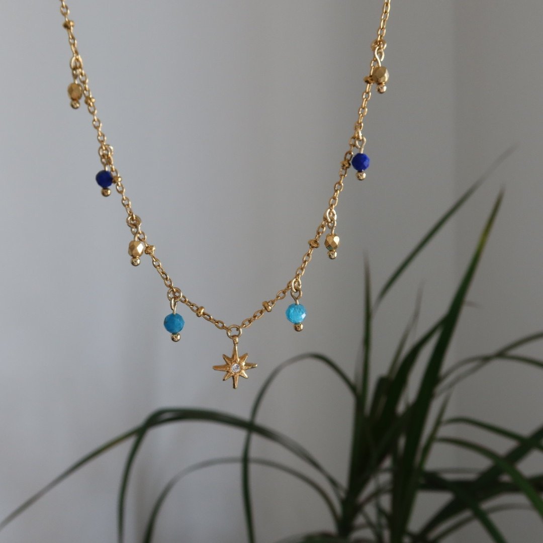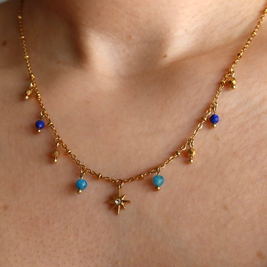 This delicate necklace is inspired by the starlit nights of Velaris. Adorned with small natural blue and golden stones, it is highlighted by a sparkling golden star pendant in stainless steel. A piece that captures the light, strength, and beauty of the worlds we love.