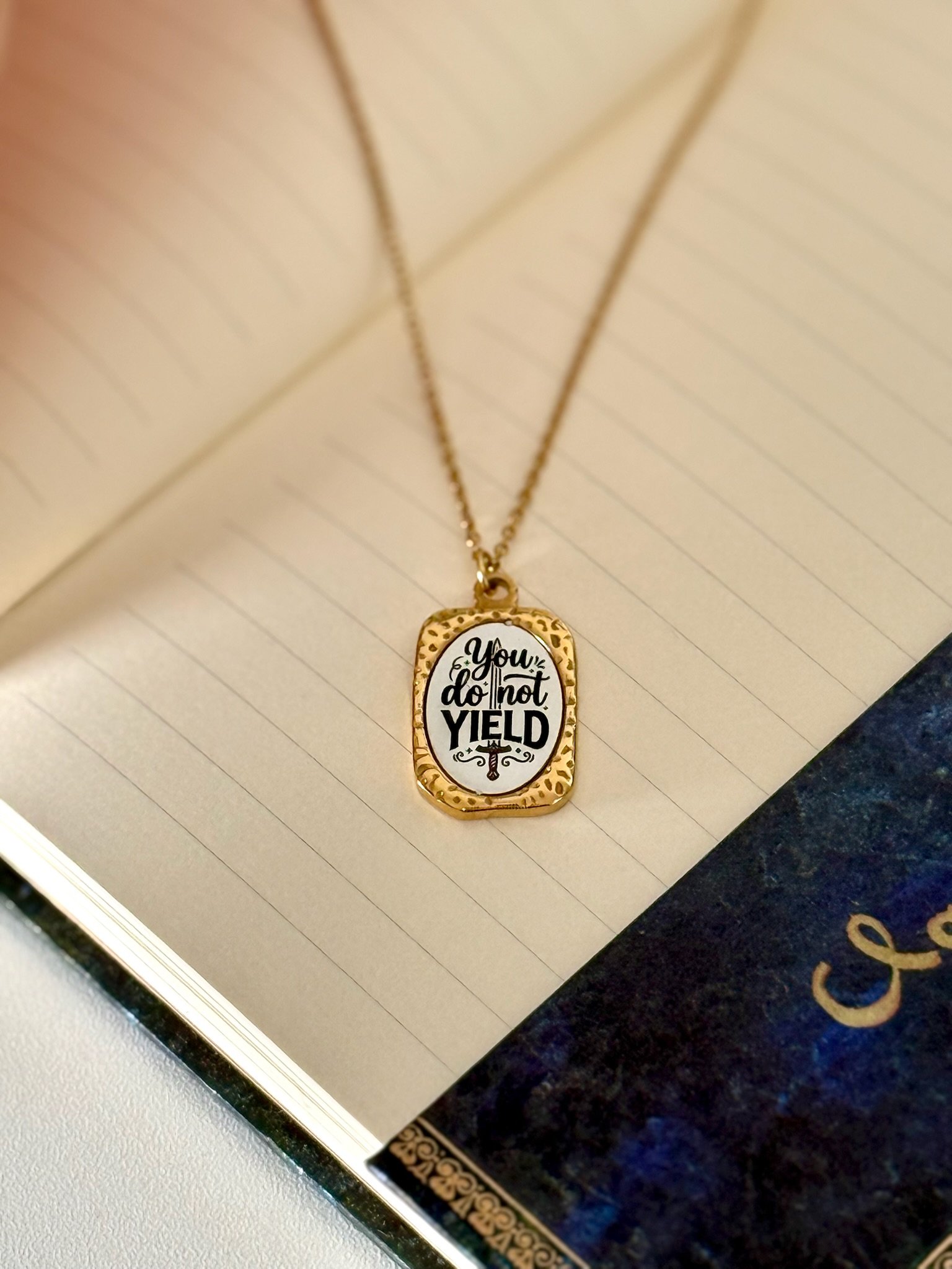 This necklace highlights one of the most powerful quotes from the Throne of glass saga: “You do not yield”. The text is engraved on a mirror-finish surface that reflects the light, adding elegance and timeless beauty. A strong and meaningful piece, perfect for fantasy lovers and for anyone wishing to carry a reminder of courage close to their heart.